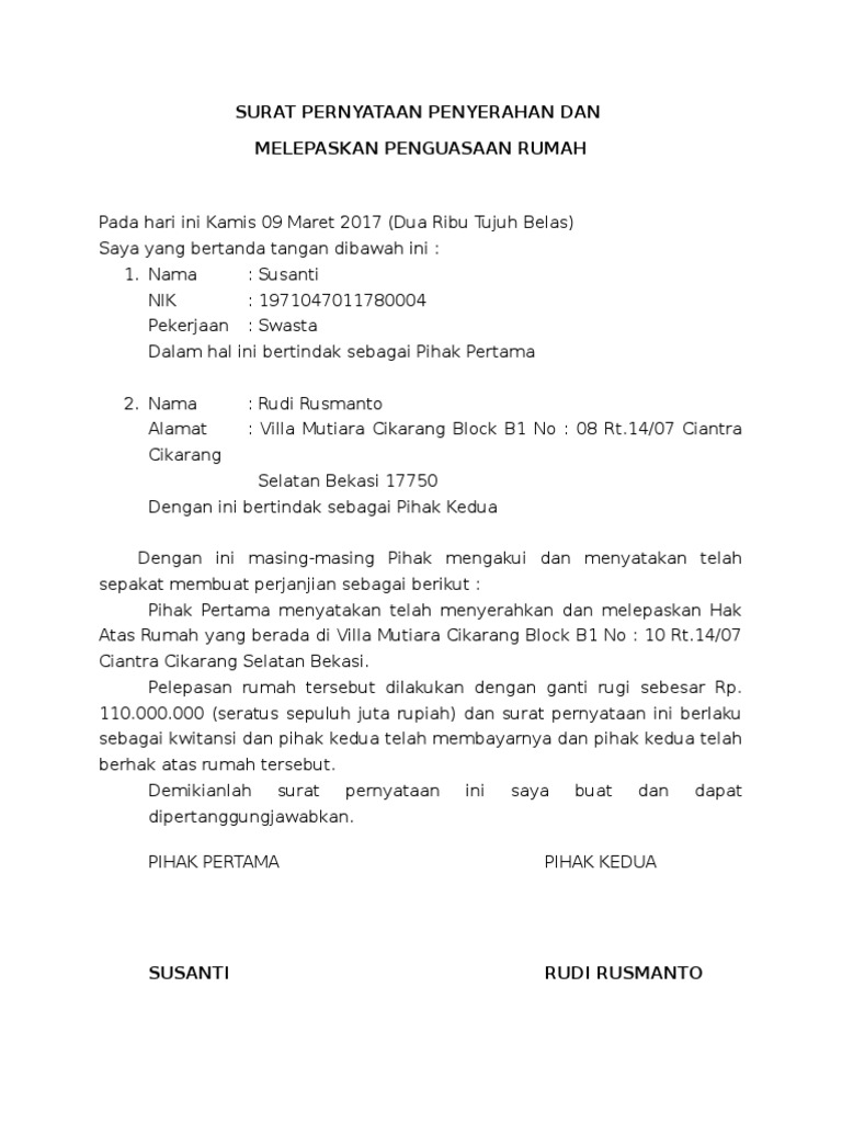 Surat Pernyataan Penyerahan Dan Melepaskan Rumah