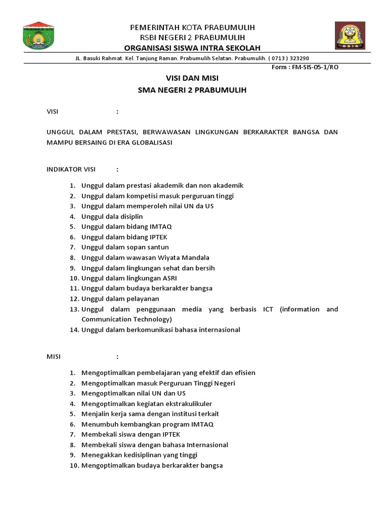 Contoh Visi Misi Osis Smp Dan Sma Wirahadie Com