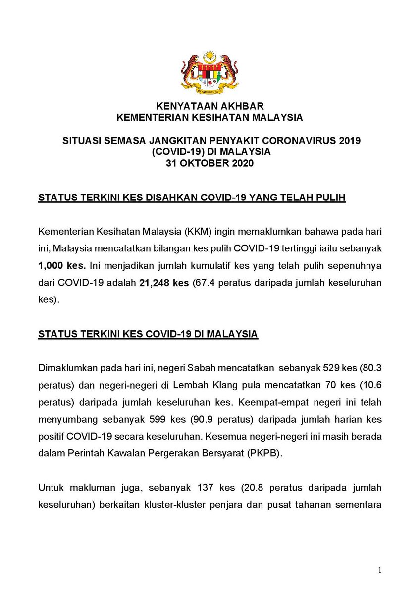 Kenyataan Akhbar Kpk 1 April 2020 Situasi Semasa Jangkitan Penyakit Coronavirus 2019 Covid 19 Di Malaysia From The Desk Of The Director General Of Health Malaysia