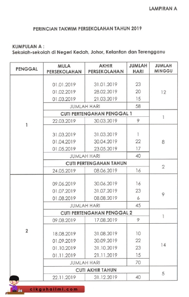Takwim Persekolahan 2019 Kumpulan A