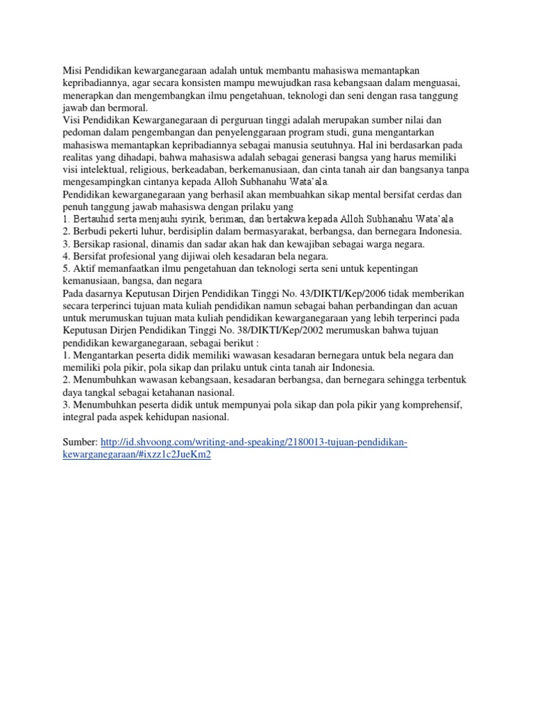 Visi Dan Misi Pendidikan Kewarganegaraan Di Indonesia